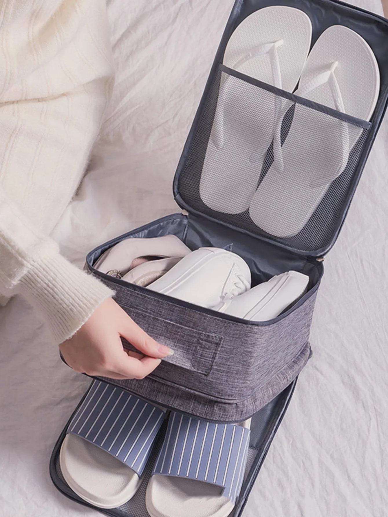 Descrição da estrutura: Existem três camadas no total, com uma camada de grande capacidade que pode acomodar sapatos de viagem tamanho 43, uma camada intermediária que pode acomodar sapatos leves, e uma camada interna que pode acomodar chinelos casa